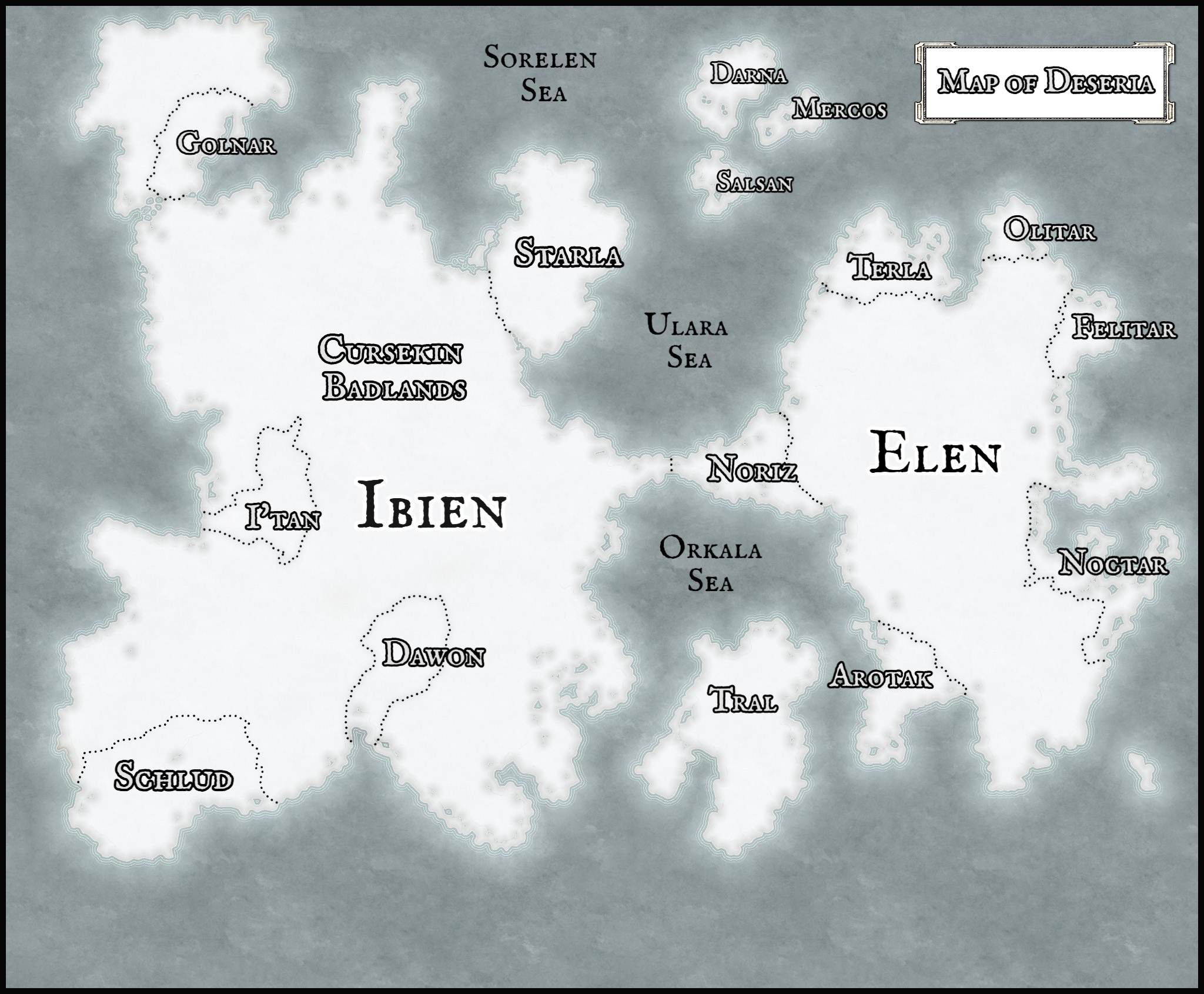 Elen– The eastern continent of Deseria, home to the humans of Noriz and Terla, gnomes of Arotak, and the elves of Olitar, Felitar and Noctar, among others.