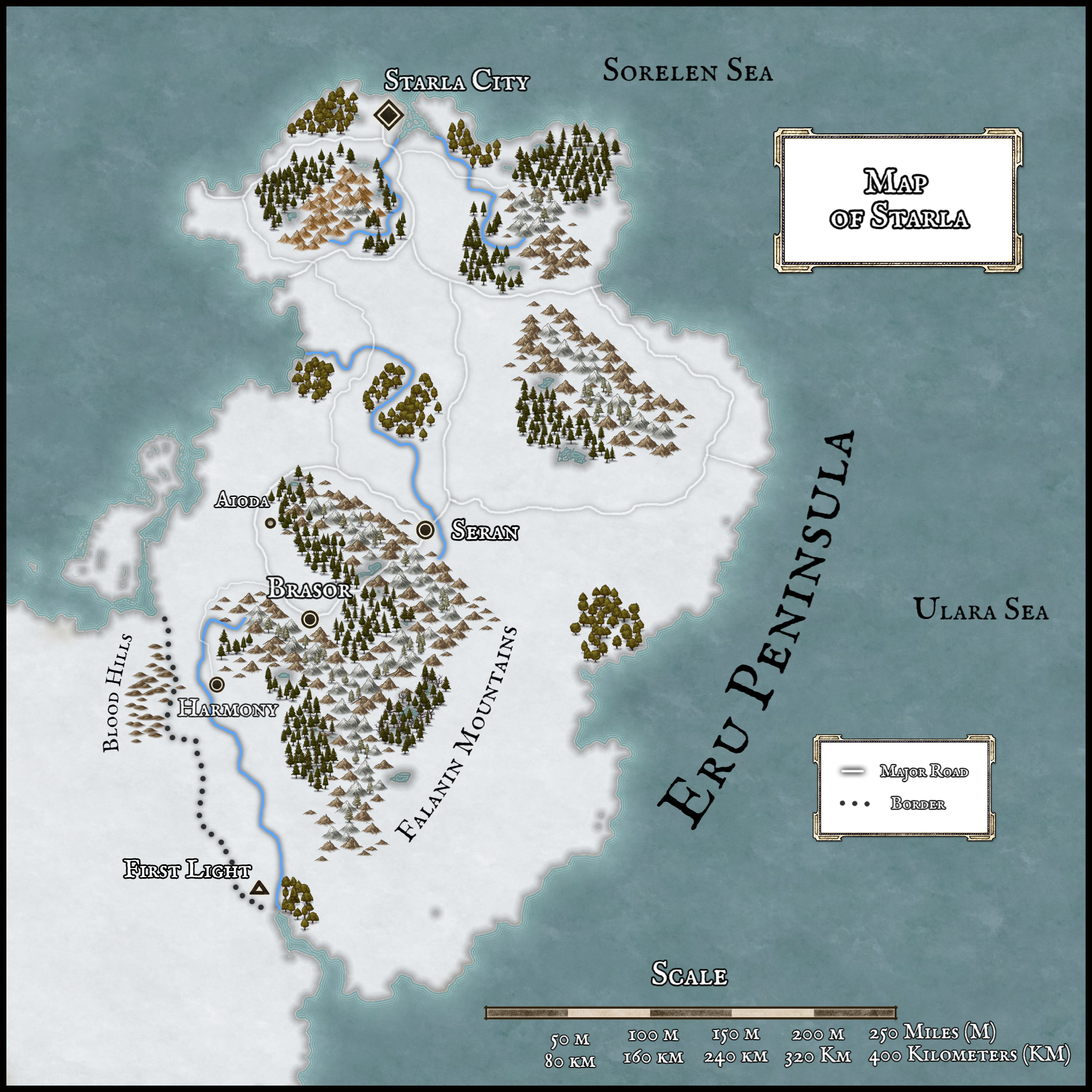 Starla / Starlan Federation– More commonly known as Starla, the Starlan Federation is the richest and most powerful nation in Deseria, established by refugees who came from the island nation of Darna after a series of catastrophes devastated the land and drove its inhabitants into exile. Starla occupies the Eru Peninsula.